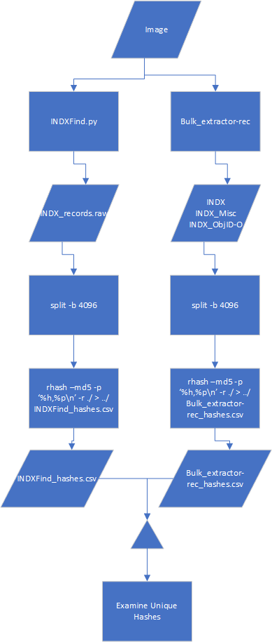 Will Ballenthin has written INDXFind.py, which is quite lovely. It relies on ewfmount, which only mounts .E01 files. I need a solution if I get something else like a .vmdk from a client. TZWorks’s wisp works for .vmdk and dd, but I didn’t get nearly as many results as Will’s tool. Of course, more is not better, but it warrants further investigation. Bulk_extractor-rec supports .raw, .img, .dd, .001, .000, .vmdk, .E01, and .aff. That could be great.